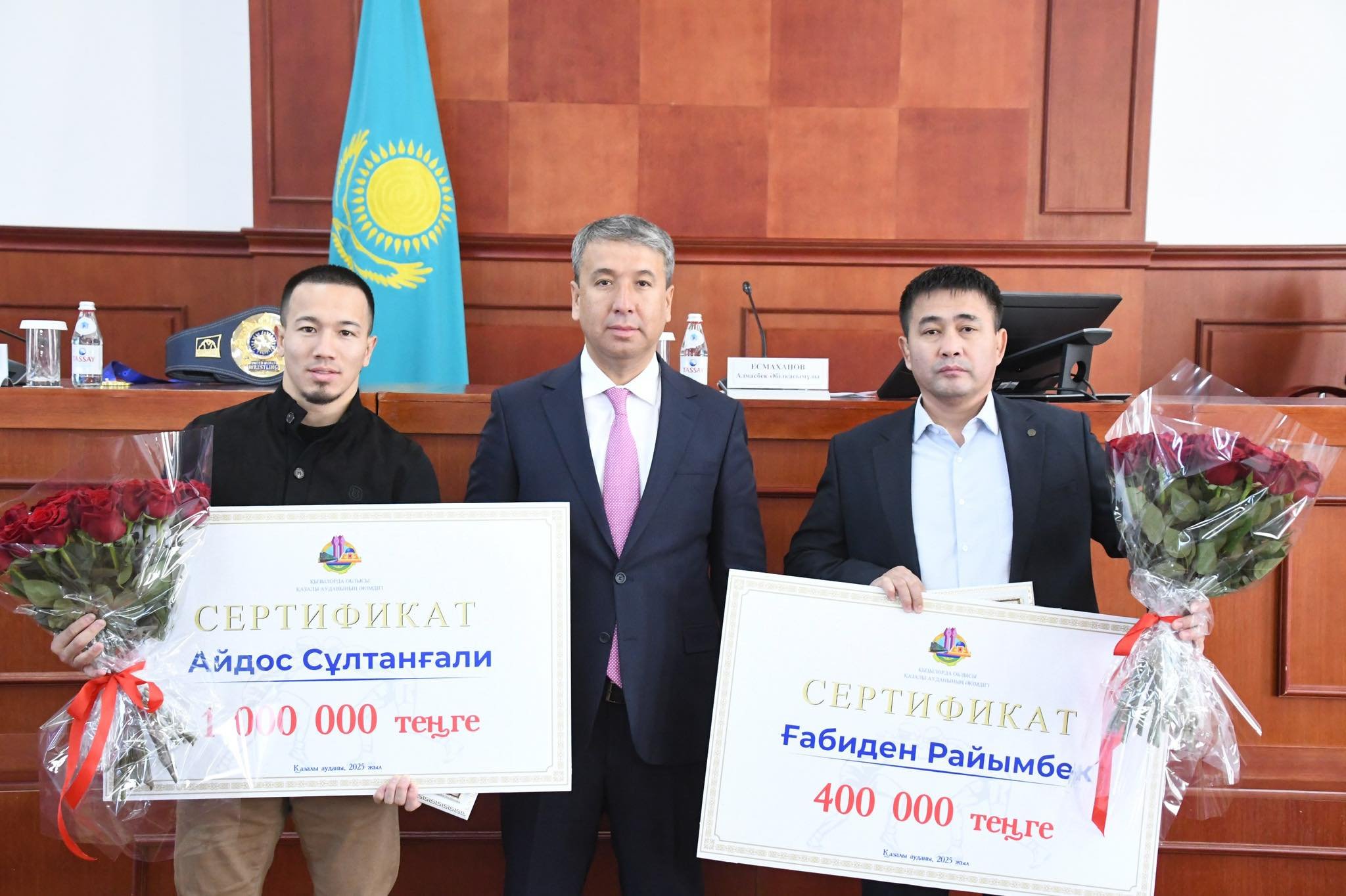 Аудан әкімі спорт әлеміндегі биік белесті бағындырған Айдос Сұлтанғалиға 1 000 000 теңгенің және спортшының бапкері Ғабиден Райымбекұлына 400 000 мың теңгенің арнайы қаржылай сертификаттарын табыстап, барша Қазалы жұртшылығының атынан жеңісімен құттықтады. Сондай-ақ батырымызды әрдайым бабында болуы үшін мұндай қолдаулар жалғаса беретіндігін жеткізді.