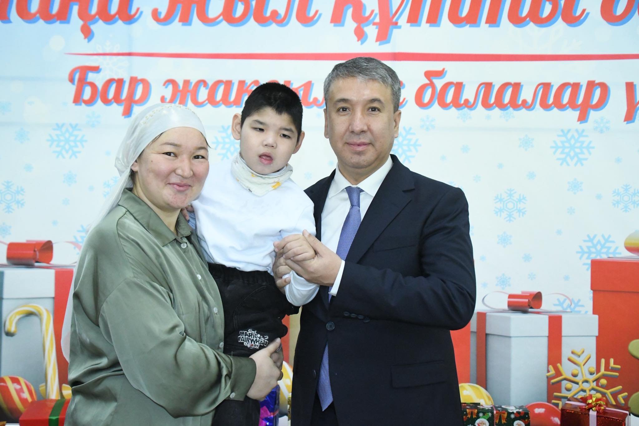 Жаңа жылдық шараға аудан әкімі Алмасбек Есмаханов арнайы барып, балалар мен олардың ата-аналарын мерекемен құттықтады.
